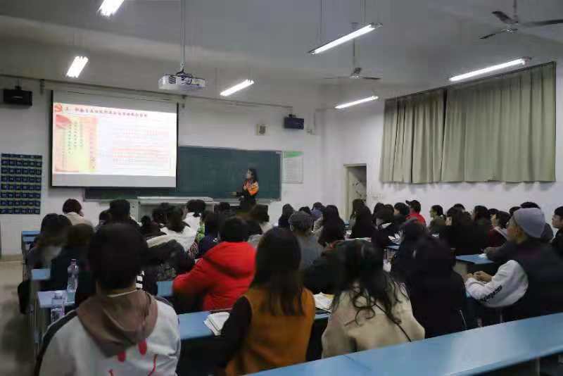 2018年11月15日19:30,传播与经管学院第二次党课培训工作在A2教学楼407教室继续开展。参与本次党课培训工作的有党总支副书记徐瑗蔚,辅导员李雄伟、匡玉玲以及四十七名学员。主讲人为文秘系系主任任丹丹。