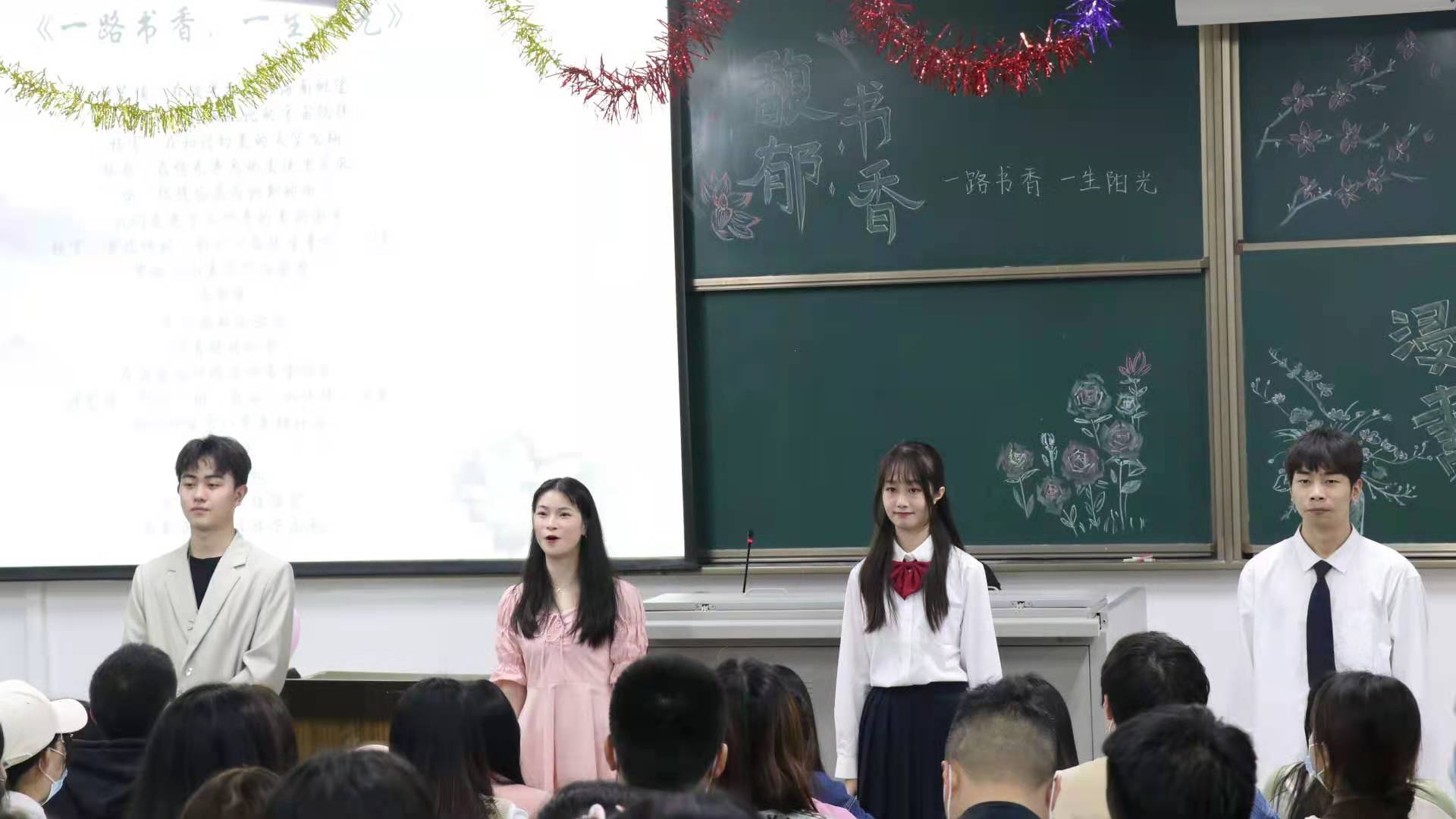 伊始,由杨用老师致开场辞,四位同学带来了《一路书香,一路阳光》诗朗诵为大会开启精彩之幕——秘书学同学魏开容为大家分享《摆渡人》精彩片段,来自传播学的唐子雯同学朗读了周国平的《守望的距离》并分享了她的个人理解感悟;而后秘书学的吴倩同学一番“人为什么要读书”主题演讲将现场气氛引入高潮。继而三组同学分别带来了《琵琶行》、《少年不识愁滋味》、《在水一方》歌曲演唱,而后王睿老师组织了《知否》集体大合唱,使现场气氛愈加活跃。