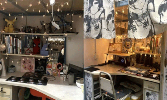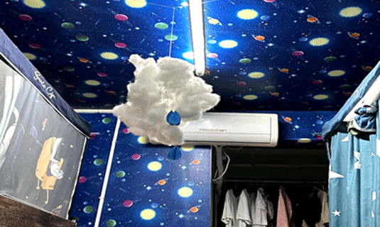 9-513是一间充满氛围感的寝室,星星灯点缀的不仅是整个空间还有他们向往的璀璨人生路的光明,漫画感则是体现少年正意气风发,愿他们在今后的路途。
