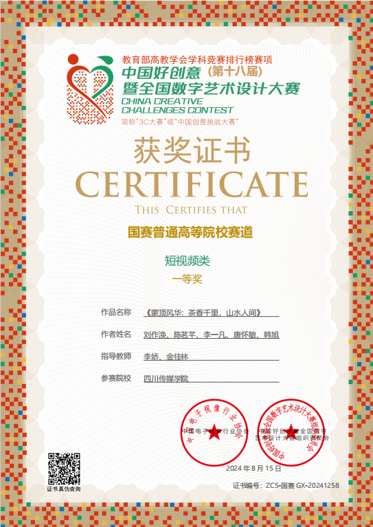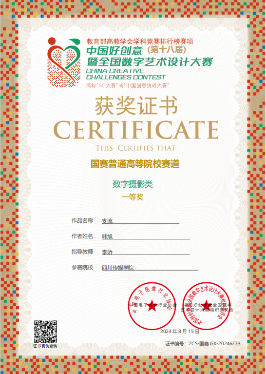 近日,第18届中国好创意大赛官方公示国赛高校赛道获奖名单。四川传媒学院共有8项作品获一等奖,其中传播与经管学院传播学专业的两组学生团队凭借其精彩亮眼的创意与卓越精湛的拍摄技术,分别取得大赛一等奖的佳绩,为学校和学院赢得了荣誉。同时,也展现出传播学专业在摄影摄像领域的创新与能力。