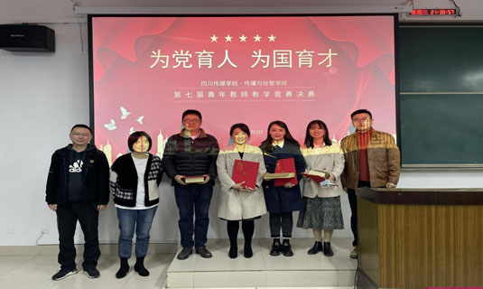 传播与经管学院院长肖建春教授、副院长金佳林副教授在讲课比赛结束的颁奖仪式上讲话,祝贺以上参赛获奖的7位青年才俊,期待来年有更多的青年教师参加讲课比赛。大家一起切磋、一起交流、相互鼓励和成长。预祝这次选拔出来参加四川传媒学院校级讲课竞赛的3位老师们飞得更高,走得更远!