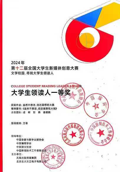 在这场充满创意与书香的赛事中,四川传媒学院传播与经管学院的同学们积极参与,精心选书、阅读并制作图书阅读推荐短视频。经过严格评审,我校学子凭借扎实的专业功底和创新思维,在阅读推荐短视频创作赛项中取得优异成绩,15部作品进入复赛。其中:万幸副教授指导,成柯、刘燕、金祖航团队作品《虽然不想活,但还是想吃火锅》荣获一等奖。获奖短视频以真实经历给予人们走出心灵困境的力量。